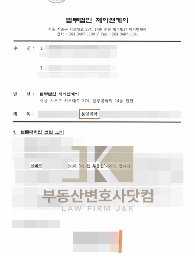▲「부동산변호사닷컴」에서 상대방(분양사) 측에 보낸 내용증명