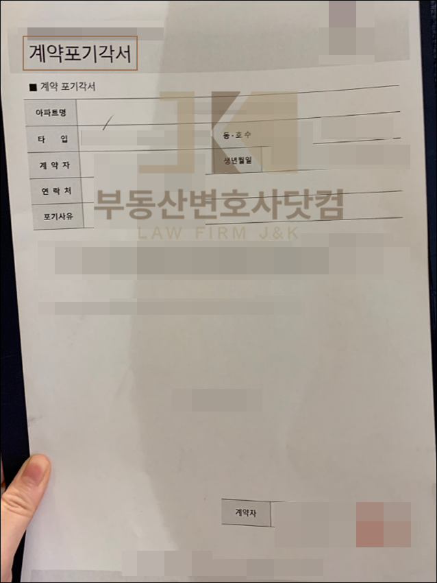 의뢰인은 상대방 측 제시 조건 수용해 직접 분양사무실 방문하여 계약포기각서 작성하며 위약금 발생 없이 분양계약 해제 합의 성공.