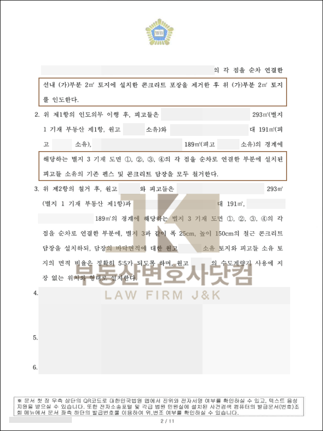 인도 의무 이행 후, 경계에 해당하는 피고들 소유의 기존 펜스 및 콘크리트 담장을 모두 철거하고, 원고 측과 피고 측은 각자의 토지 면적 비율을 5:5로 하여 의뢰인의 수도계량기 사용에 지장 없는 위치와 형태로 담장을 설치하라고 판시.