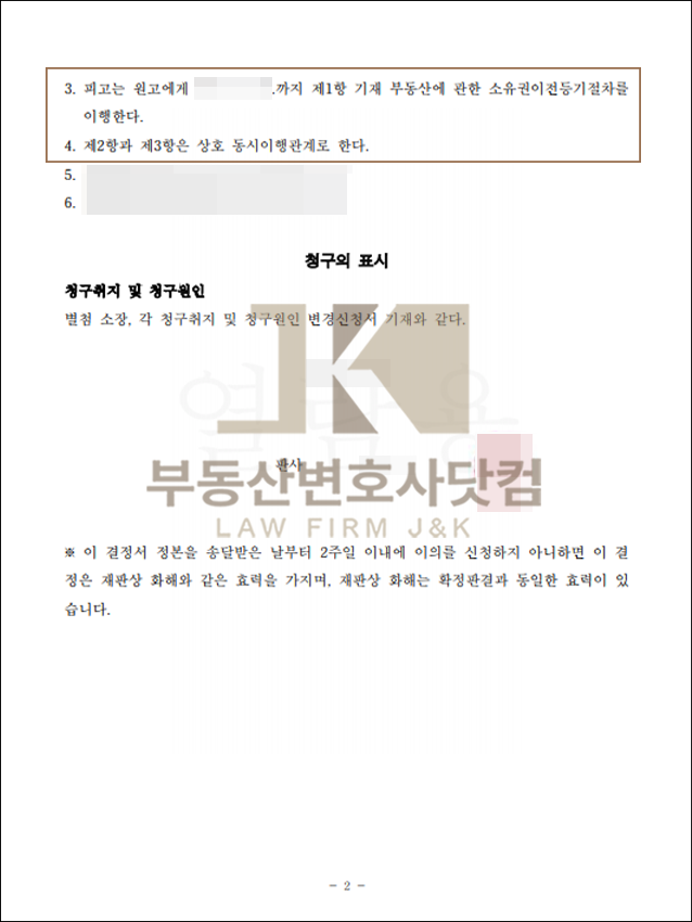 피고 1의 소송수계인들은 원고의 청구에 대해 어떠한 항변도 하지 않아 1/2 지분은 확보하였으나, 나머지 1/2 지분 소유자인 피고 2는 이의신청.